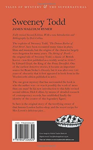Sweeney Todd | James Rymer | Wordsworth Tales of Mystery & the Supernatural | Sweeney Todd The String of Pearls by James Rymer with a New Introduction by Dick Collins. The exploits of Sweeney Todd, The Demon Barber of Fleet Street, have been recounted many times in plays, films and musicals, but the origins of the character largely were forgotten for many years. The String of Pearls - the original tale of Sweeney Todd, a classic of British horror - was first published as a weekly serial in 1846-7 by Edward Lloyd, the King of the Penny Dreadfuls. One of the earliest detective stories, it became an important source for Bram Stoker's Dracula, but it was after over 150 years of obscurity that it appeared first in book form in the Wordsworth edition published in 2005. The one great mystery that has surrounded the book is who the author was - or was it possibly the work of more than one man?